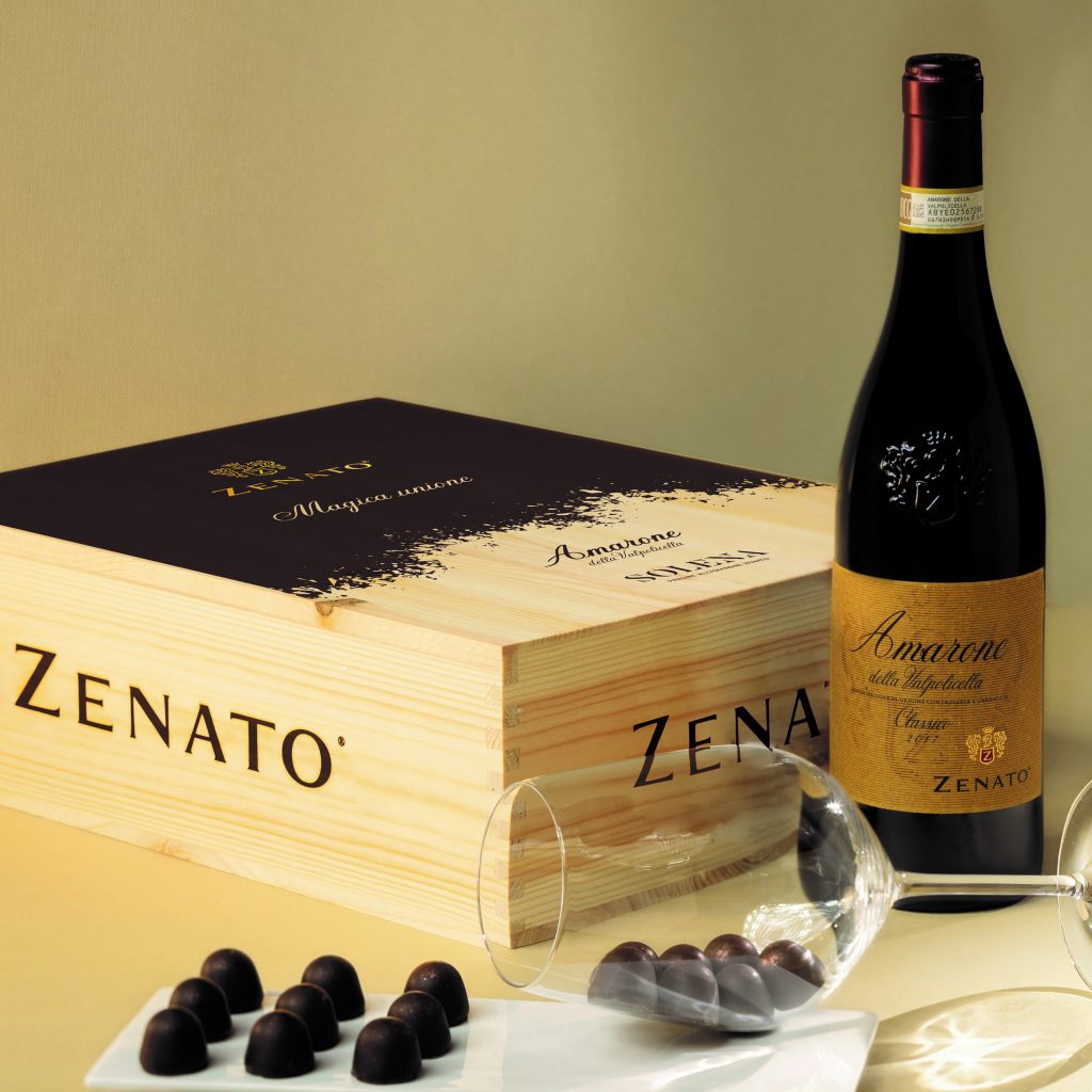 Croatina (10%) dei vigneti più vecchi coltivati nella Tenuta Costalunga a Sant’Ambrogio, in Valpolicella. In questa esclusiva verticale: L’esclusiva verticale di Amarone Riserva Sergio Zenato con le annate 2006, 2007, 2009. Per chi ama un brindisi tutto italiano, il Lugana Metodo Classico Brut Zenato in formato Magnum. C’è anche la confezione in edizione limitata “Magica unione”: 16 praline Solena e una bottiglia di Amarone della Valpolicella DOCG Zenato, un vino di grande struttura, complesso, elegante, vellutato.