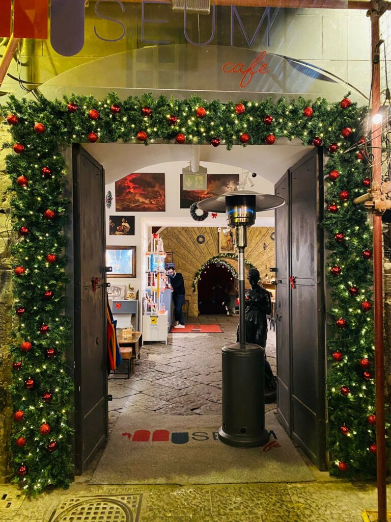 Salendo i tribunali si può arrivare facilmente a piazzetta Nilo, dove, proprio al cospetto della statua del Dio Nilo nasce Museum Cafè un luogo che mette insieme miscelazione con un cocktail bar premium, l’arte con le riproduzioni fedeli delle opere di Pompei, la cultura con la mostra permanente delle foto di Luciano De Crescenzo. Un luogo speciale che diventerà il centro pulsante del centro storico con la sua proposta di brunch del 24: dalle 12 alle 19 intrattenimento musicale, proposte food della tradizione napoletana, i drink hand made del bar tender Fabrizio Ferruzzi, e la possibilità di scambiarsi auguri approfittando anche dello shop tra gioielli pompeiani, t-shirt illustrate e oggetti d’arte che parlano della storia di Napoli.