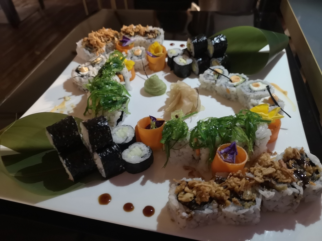 Così dopo un aperitivo a base di fritture nel classico “coppo”, passiamo alla degustazione del sushi sia nella sua versione “classica” a base di pesce seppur declinato “alla sicula” con polpa di ricci, tonno, ricciola, spigola, scampi e gamberoni rossi, che in quella “veg” sorprendente non solo per gli accostamenti originali di sapori ma anche per la varietà della proposta che riesce a rendere nitido e facilmente distinguibile ogni sapore che risulta di grande carattere e personalità come il sushi alla norma con crema di melanzane e pomodorini confit o quello con avocado e cipolla croccante o alga nori e maionese veg, solo per citarne alcuni.