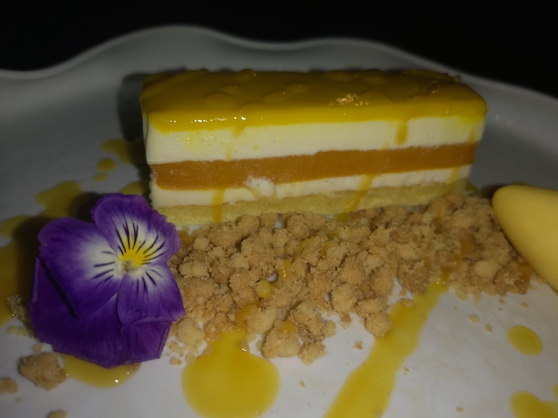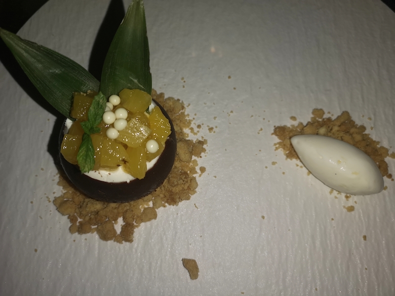 Nel frattempo è arrivato il dessert. Ad interrompere la nostra chiacchierata due dolci molto diversi tra loro, ma altrettanto buoni. Il primo è una rivisitazione del babà in un guscio di cioccolato fondente ripieno di crema al rum su crumble di frolla e brunoise di mango, il secondo è una mousse di mango ricoperta da coulisse di frutto della passione su crumble di frolla. Il nostro percorso volge al termine, è tempo di salutarsi e di sorridere ai (tanti) progetti futuri sebbene con il volto (ancora) coperto dalle mascherine.
