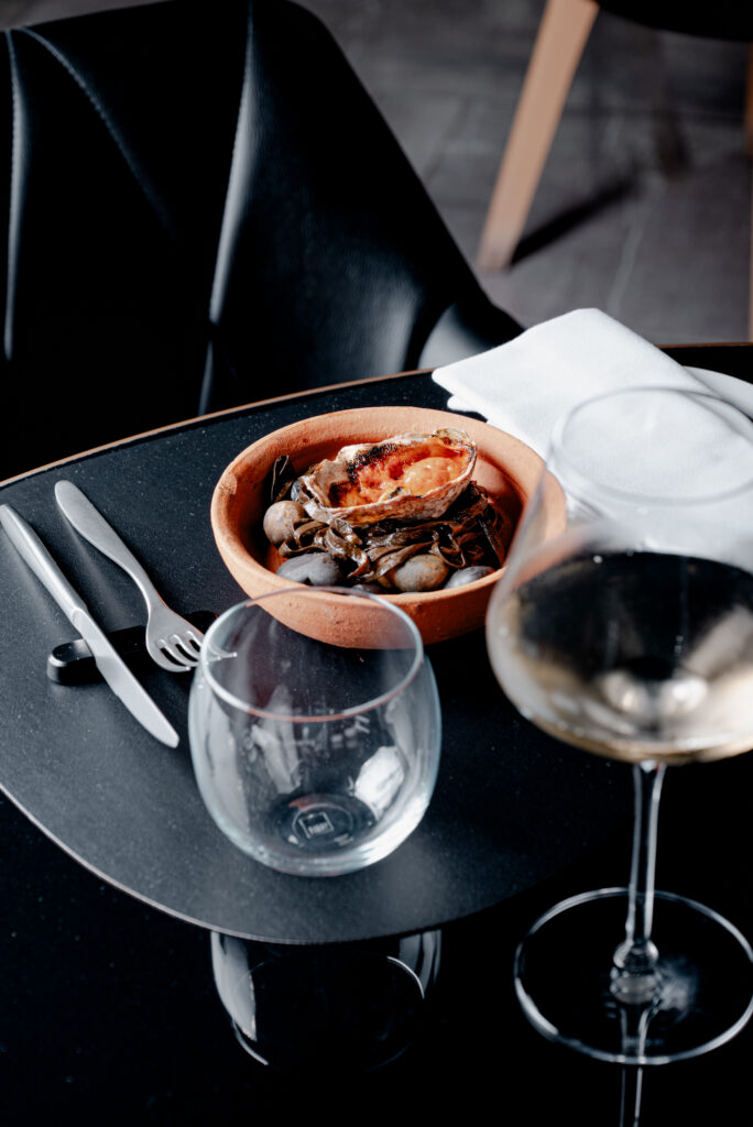 Che tutto questo avvenga a Poggio a Caiano rende il progetto ancora più interessante. In un territorio lontano dal mare, Noah Fish diventa un laboratorio che usa la grammatica toscana del fuoco per riscrivere quella della cucina di pesce. Accanto al mare, la carne resta contrappunto naturale: animelle, pollastri allevati a terra, costate. Non per distrarre, ma per ricordare che questa è una cucina che ragiona per analogie, trattando il pesce con lo stesso rispetto e severità riservata agli animali da macello.