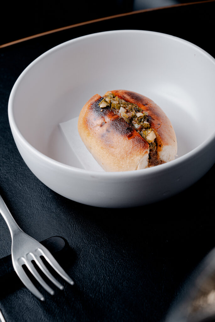 La massima espressione del progetto è un bun caldo, soffice, farcito con una zuppa densa di occhi e interiora di pesce. È un morso che spiazza e chiede attenzione: amaro, iodio, profondità quasi animale, più simile a una frattaglia bovina che a un piatto di mare.