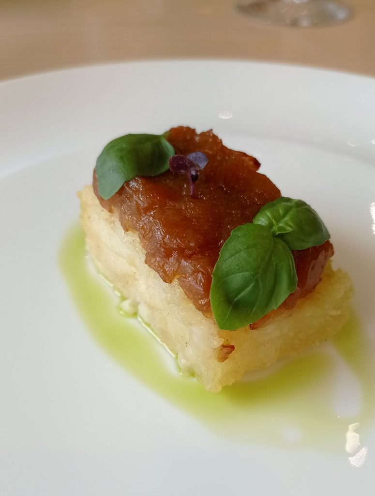 Si prosegue con la Parmigiana di baccalà, un piatto che potrebbe essere due cose: una forzatura di gusto o, letteralmente, un capolavoro. Ancora una volta le giovanissime toque campane sfoderano sicurezza nel bilanciare un piatto non semplice. Oltre al baccalà, ci sono tutti gli elementi della classica parmigiana di melanzane, con un piacevole corredo di stracciata di bufala.