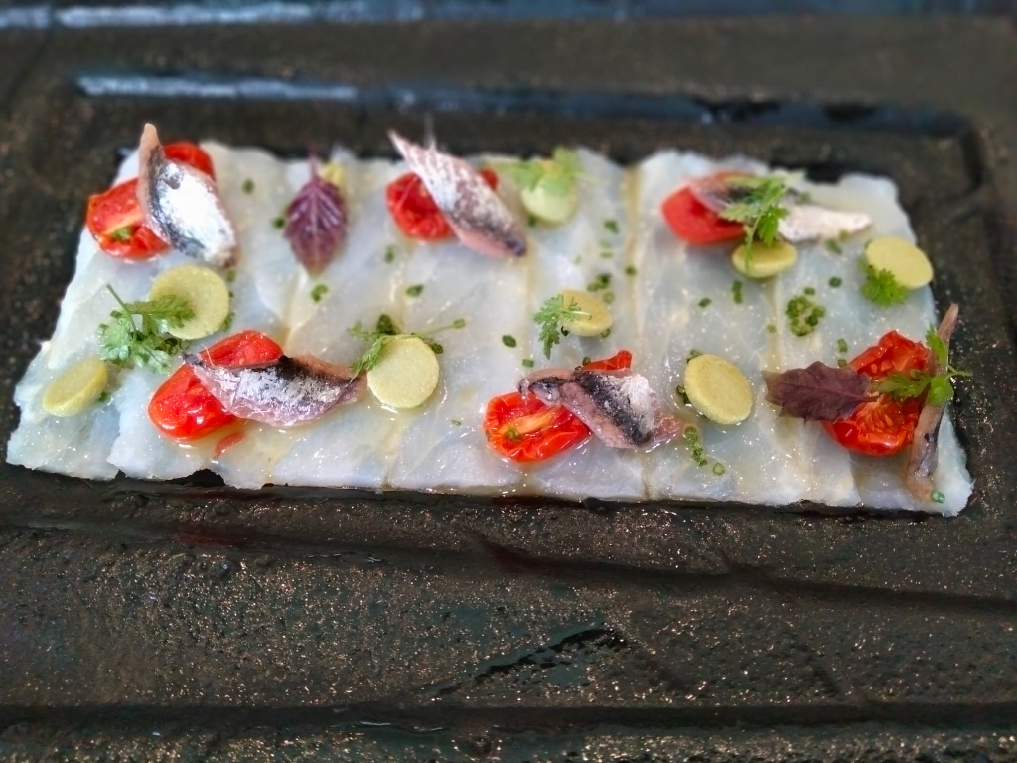 Si parte con il Carpaccio di baccalà e chips realizzate con la sua stessa pelle. E l’asticella va già su, altissima. Baccalà crudo, scioglievole, corredato dagli stessi elementi suggeriti dalla tradizione: olive, acciughe, pomodori secchi, olio e limone.