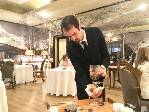 Complessità tecnica anche per lo Schiaccianoci, un dolce che richiama un piatto di legno di tradizione valdostana che contiene le noci e che ha, al centro, un pilone su cui si schiacciano al momento grazie a un martelletto. Nelle mani di Griffa, la rivisitazione dolce diventa un guscio di noce di cioccolato, con all’interno nocino, caramello allo sciroppo d’acero, cremoso al cioccolato e tè affumicato, gianduia alle noci, pere marinate al ginepro, bacche di crespino, levistico (sedano selvatico) e malli di noce canditi.