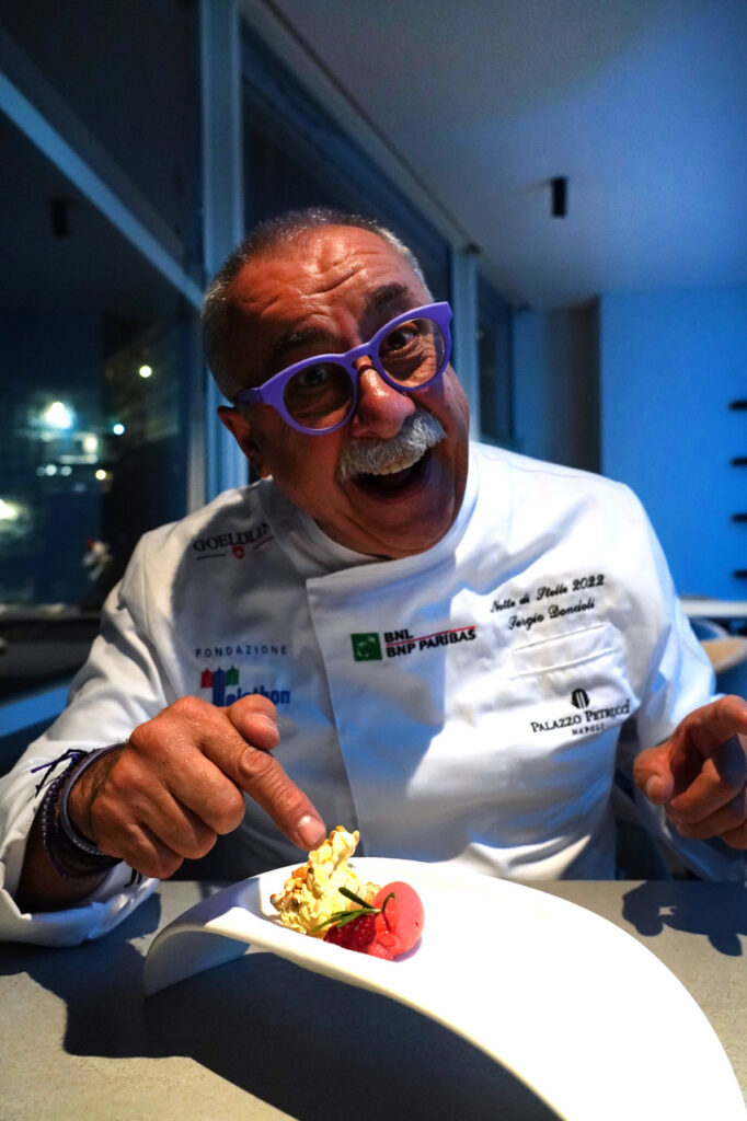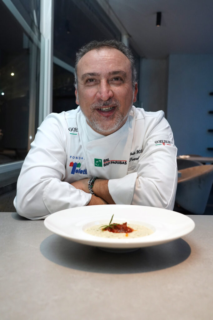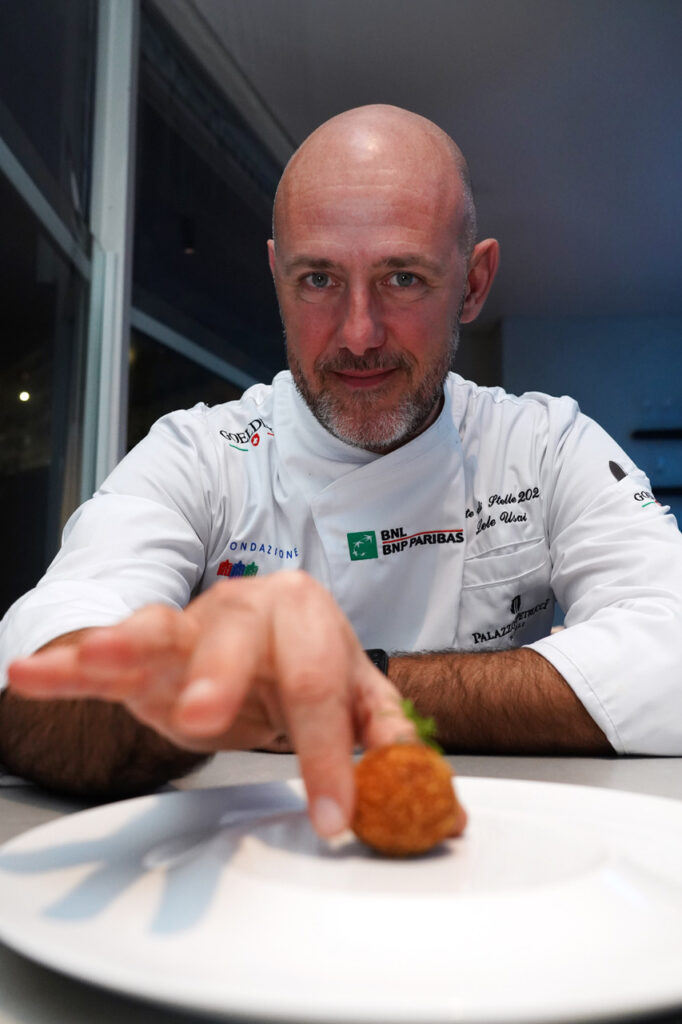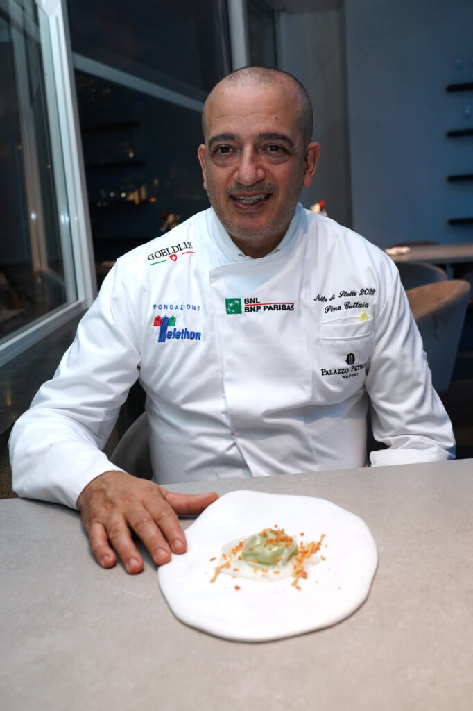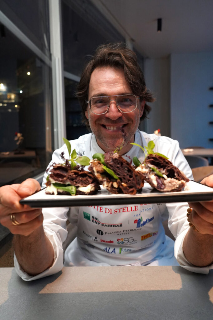 Al piano del ristorante sulla spiaggia, Lele Usai, chef del ristorante stella Michelin Il Tino di Fiumicino, ha aperto gli assaggi alla sua postazione con l’Arancino di triglia alla cacciatora. Interpretazione marinara del classico supplì romano che ha spiegato la cifra stilistica dell’altro locale di Lele Usai, il QuarantunoDodici premiato quest’anno dalla Guida Michelin con il Big Gourmand che segnala i ristoranti dall’ottimo rapporto qualità prezzo. E poi i delicatissimi Cappelletti con parmigiano stagionato 60 mesi in brodo di murena ed alghe. Lino Scarallo, chef del ristorante stella Michelin Palazzo Petrucci, ha riproposto in nuova veste i classici della cucina partenopea con un folgorante panuozzo alla genovese e un convincente risotto mantecato al caciocavallo con soffritto napoletano. Piatto ora nella carta del ristorante. E piatti creativi come le tagliatelle di calamaro con “panna”, prosciutto e funghi.