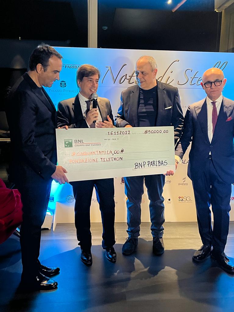Al termine della serata, che ha visto la partecipazione di un ricco parterre, Rino Allaria, responsabile Corporate BNL Direzione Territoriale Sud, e Edoardo Trotta, patron di Palazzo Petrucci, hanno consegnato un assegno di 50 mila € ad Alessandro Betti, direttore Raccolta fondi di Fondazione Telethon.