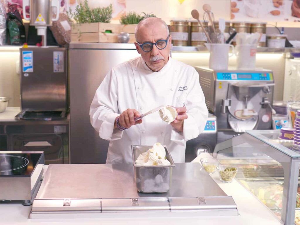 Gelato alla Crema di Santa Fina con bacche di vaniglia bourbon del Madagascar, pistilli di zafferano di San Gimignano e pinoli di Pisa (Sergio Dondoli)