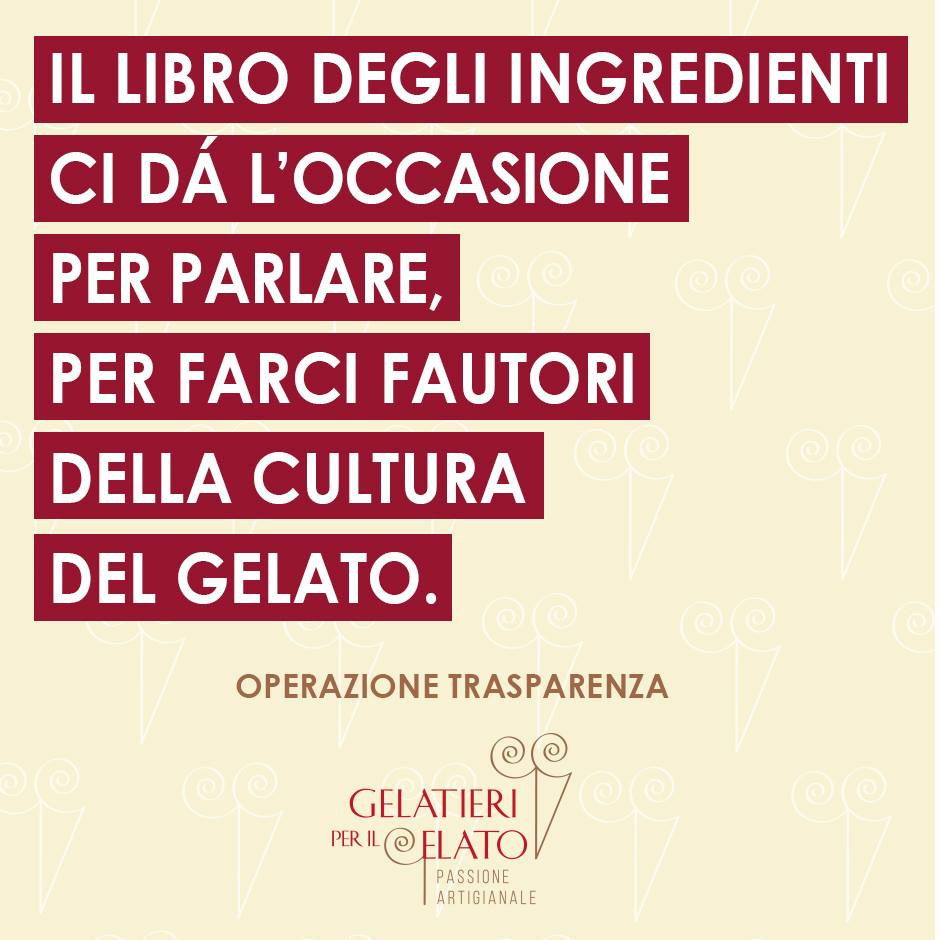 Operazione Trasparenza prevede, fino al 15 giugno, una serie di iniziative e appuntamenti in tutte le gelaterie associate per far conoscere come nasce il vero gelato artigianale e quali sono le condizioni in cui si può definire tale ma soprattutto come è fatto. Grande importanza è riservata al libro degli ingredienti, disponibile in tutte le gelaterie aderenti. Al suo interno, i gusti sono minuziosamente raccontati partendo dagli ingredienti utilizzati nella preparazione.