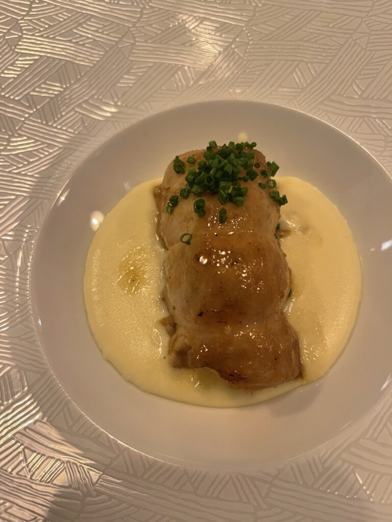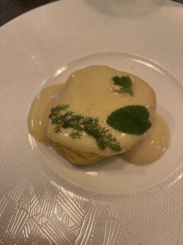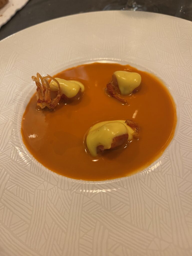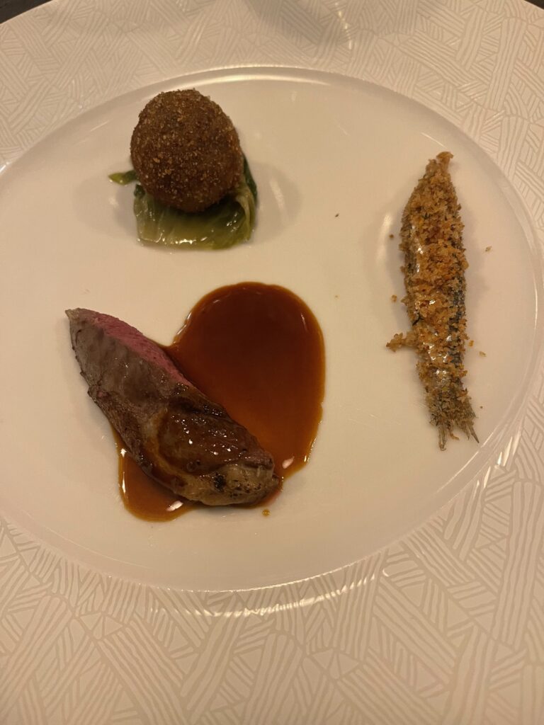 Il viaggio culinario della cena è iniziato con un set di amuse bouche (lollipop di baccalà, melograno e mousse di alici; ritz homemade con pate di fegato di coniglio e gel al lemongrass; nuggets di pollo e peperoni con mousse di fegatini di pollo; aglione in pastella con tartufo bianco), accompagnate da una selezione di pane fatto in casa e da un burro affumicato e aromatizzato all’aglio e aringa. Si prosegue poi in modo deciso con il Gambero alla carbonara, un piatto iconico di Impero che gioca con la tradizione romana in modo sorprendente. A seguire, il Coniglio, scampo e parmentier di Giovannini ha mostrato un perfetto equilibrio tra terra e mare.