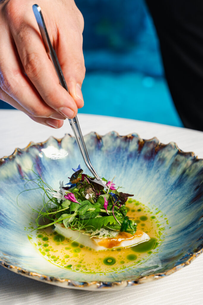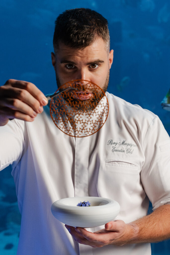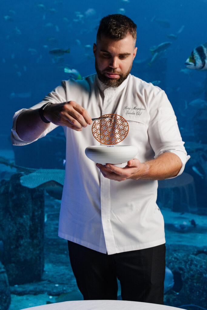 Dietro questa messa in scena gastronomica c’è oggi anche la mano del nuovo Executive Chef Remy Marquignon, che porta una sensibilità francese fatta di rigore, eleganza e rispetto assoluto della materia prima, senza tradire l’anima originaria di Ossiano. Ma qui, più che il nome in cucina, conta l’effetto finale: una sequenza di piatti che dialogano con l’ambiente, con la luce blu dell’acquario e con l’umore dell’ospite.