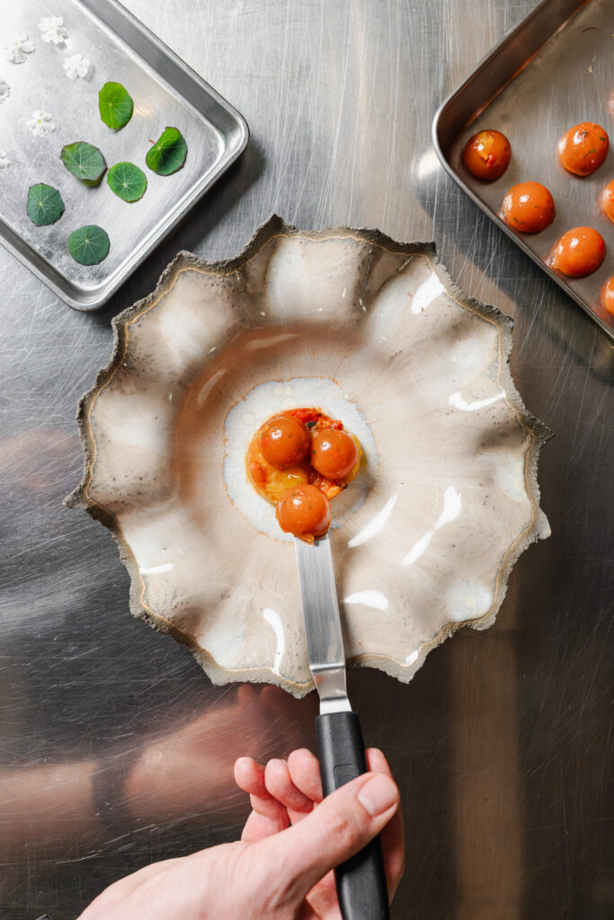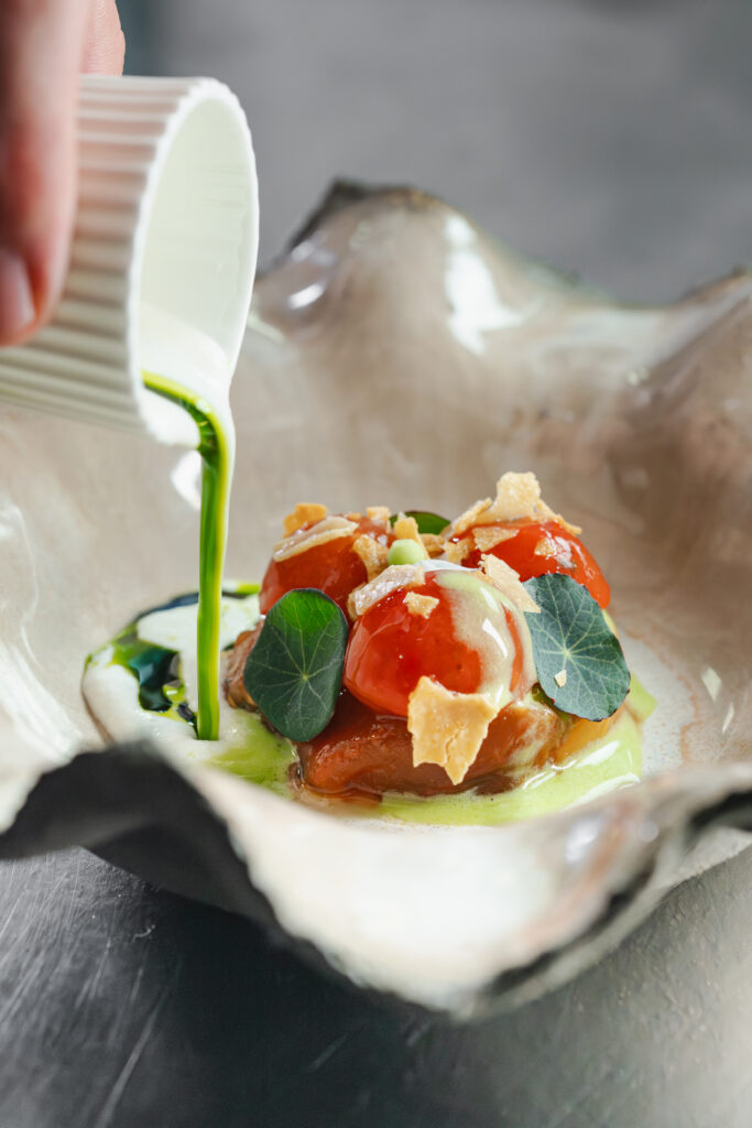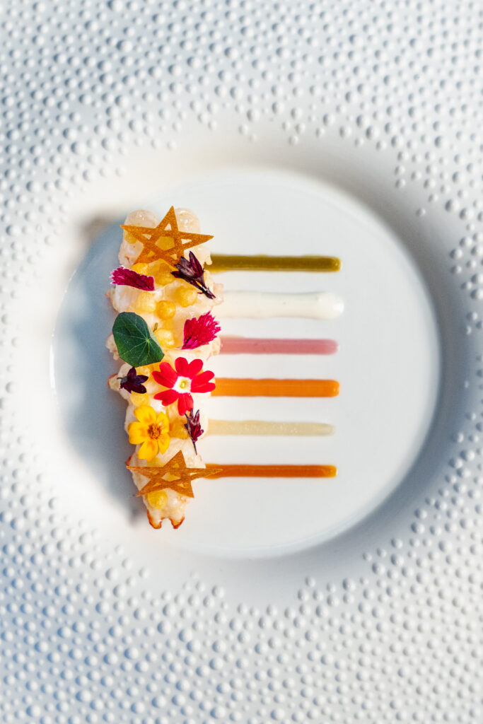 Il menu degustazione da nove portate è costruito come un racconto che alterna delicatezza, sorpresa e colpi di scena. Si parte con Tomato, un piatto che sembra minimalista ma che esplode di sfumature: pomodori heirloom semicotti, sfere di pomodoro secco, succo di pomodoro, basilico e una mozzarella profumata al verbena che aggiunge una nota quasi floreale. È un inizio luminoso, pulito, rassicurante.