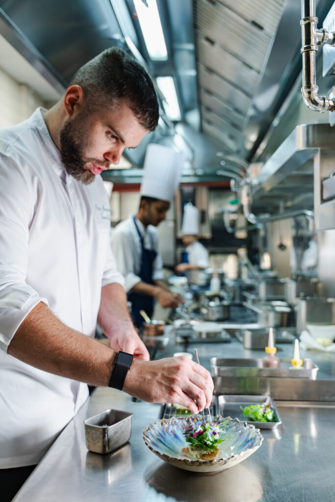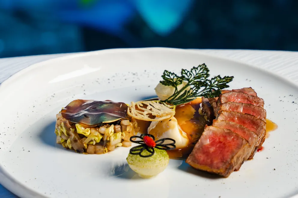 L’atmosfera è ovattata, elegante, quasi irreale. Con soli cinquantaquattro coperti a sera, Ossiano mantiene un’intimità rara per una metropoli come Dubai, e restituisce quella sensazione di esclusività che fa sentire ogni ospite al centro di qualcosa di irripetibile. Qui il tempo rallenta, i telefoni restano nelle tasche e l’attenzione si sposta naturalmente sul piatto e su ciò che lo circonda.