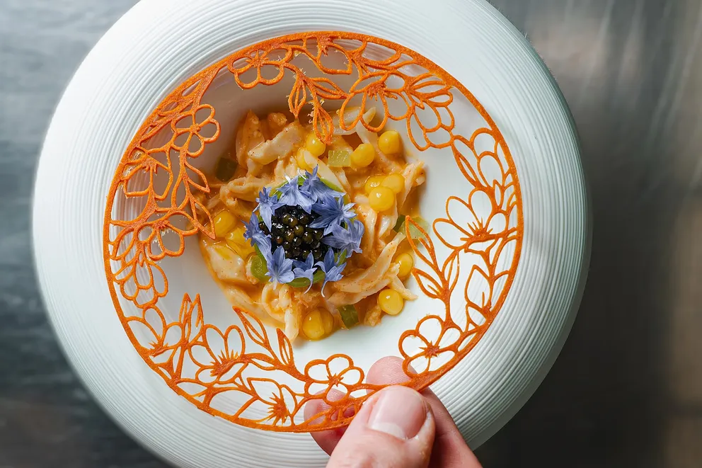 Poi arriva King Crab, più teatrale e stratificato: il granchio reale al vapore affonda in un chawanmushi di aragosta, arricchito da miso, gochujang e sambal, con cetriolo in salamoia, aloe vera, sferificazione di tuorlo e riso soffiato. La tuile al bisque va rotta al momento, aggiungendo croccantezza e una profondità marina intensa che cambia il piatto a ogni cucchiaiata.