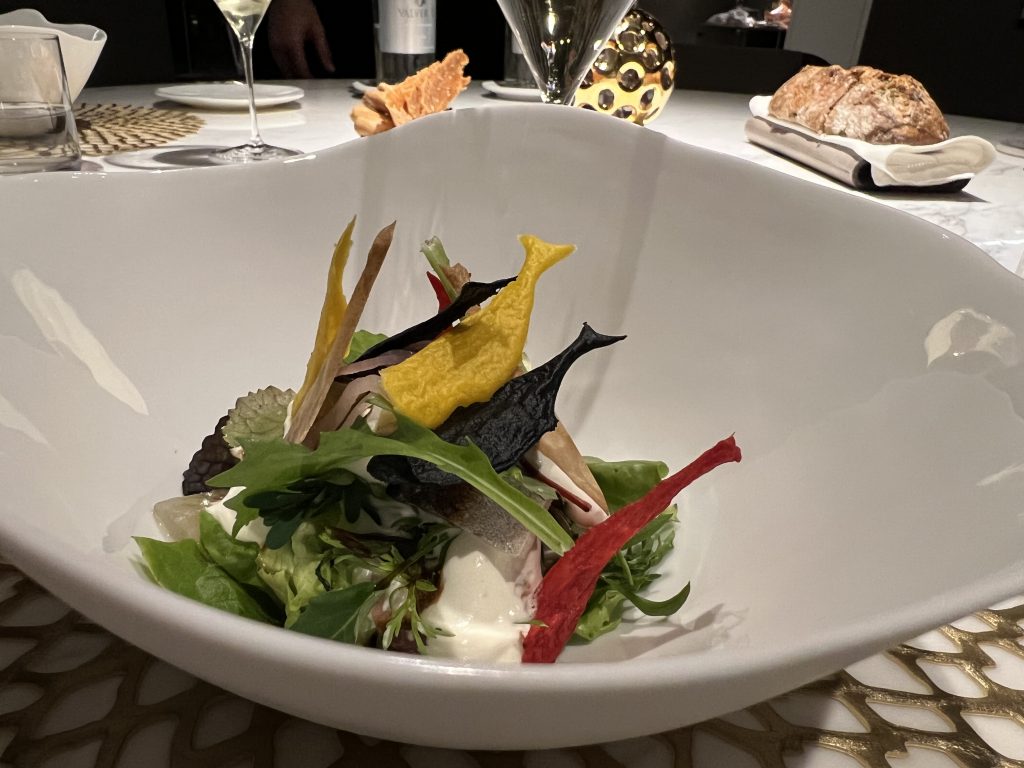 Tra gli antipasti, l’Insalatina di sgombro, uva e panna affumicata è un piatto fresco ed equilibrato che prepara il palato all’antipasto successivo più sostanzioso e gustoso: il Vitello, cipollotti e pioppini. A questa portata va un plauso per il perfetto connubio tra ingredienti molto difficili per un antipasto, che viaggiano a senso unico, in modo armonico e deciso.