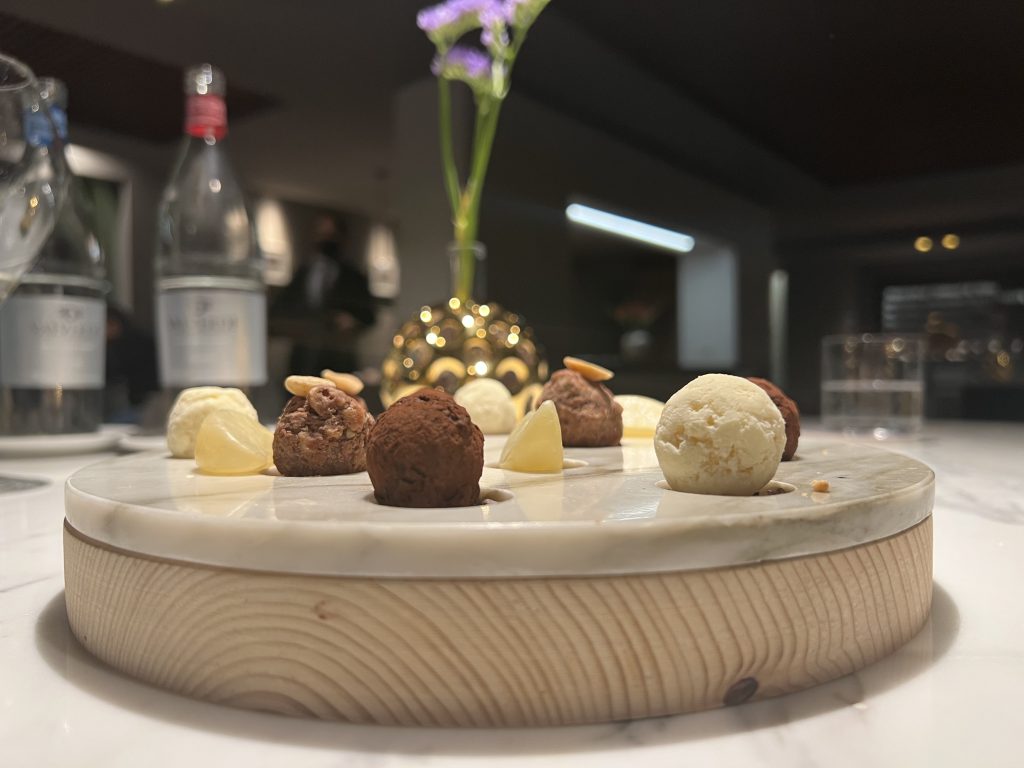 Per quanto riguarda i dessert, il Tacos al cioccolato, gelato allo zenzero è un dolce fresco, fatto di contrasti: tra la fredda nota speziata dello zenzero, la croccante nota amara del tacos al cacao e il dolce delle namelaka fondente e al latte.