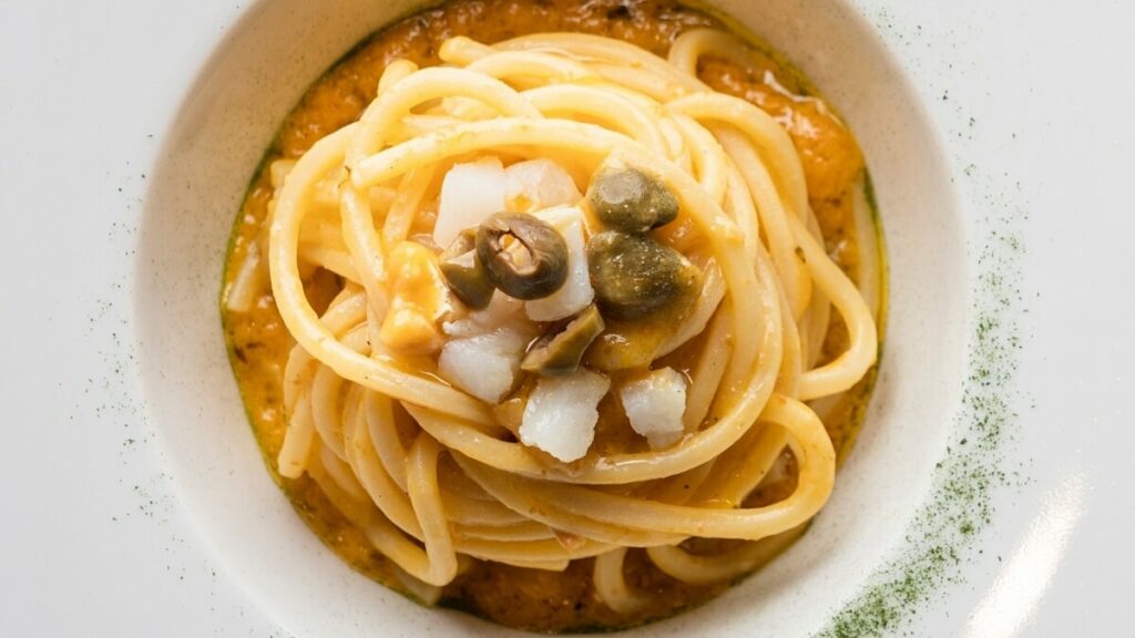 Nel corso della degustazione il baccalà è apparso in espressioni diverse, ognuna con una personalità propria frutto di uno studio approfondito dello chef Lorenzo Giacco su questo ingrediente: mantecato morbido, come vuole la tradizione portoghese; in versione croccante, con i classici filetti pastellati o nell’originale “Baccarciofo ; avvolgente, nel taglio delle Isole Faroer, che diventa secondo piatto dalla consistenza quasi burrosa; romantico, protagonista di una ricetta che Lorenzo dedicò ad Adele e che è ancora in menu, accompagnato da uno spaghetto lungo di Gragnano, pomodori datterini gialli, olive taggiasche, capperi e origano.