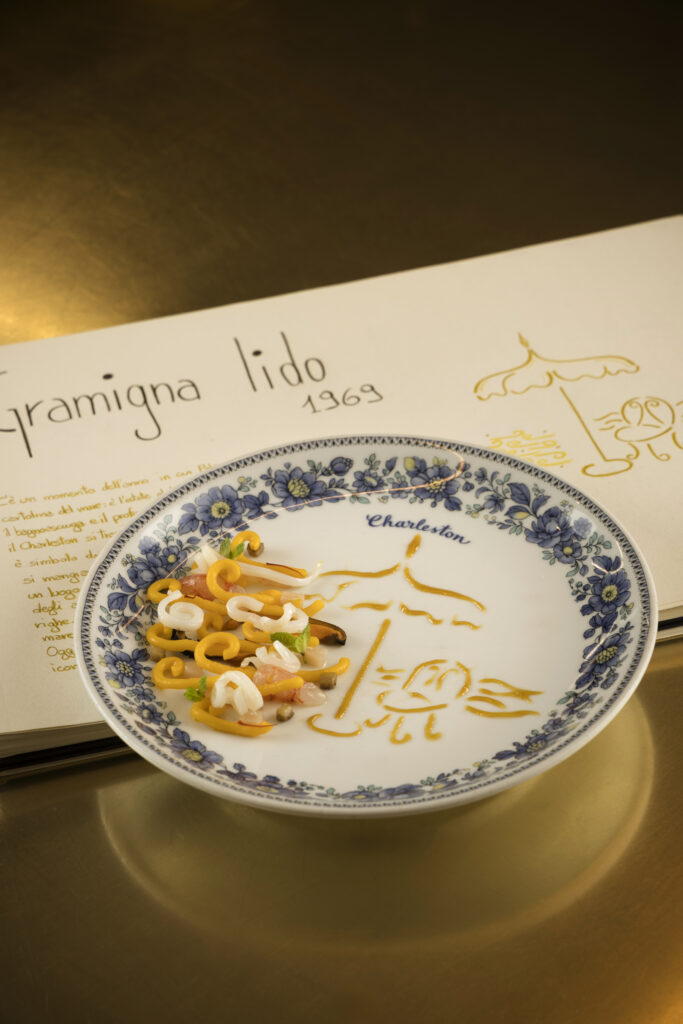 Già negli anni Settanta, i cuochi del Charleston portavano a Palermo influenze internazionali, dando vita a piatti iconici come il filetto allo sherry o i grandi flambé in sala. Oggi quella filosofia ritorna con nuove forme e nuovi linguaggi. Tra questi, la “Turtle Soup 1969”, zuppa di tartaruga, reinterpretata come una raffinata minestra: un richiamo all’arte di Andy Warhol nella riproduzione della figura della tartaruga; la “Gramigna Lido 1969”, un omaggio ad un piatto iconico che celebra gli anni trascorsi nella terrazza che ha ospitato il Charleston a Mondello; alla lampada, un tributo ai celebri maître di sala del Charleston con un filetto aromatizzato al whisky, dalla preziosa collezione custodita dalla famiglia Glorioso con più di cento etichette. Due dessert, omaggio alla storia del Charleston: la “Coppa Charleston” e il “Turbante del Sultano”. Fuori menù la dolcezza non manca di ironia e poesia: “Ma quanto costano le banane a Palermo?” È il dolce ispirato a “Johnny Stecchino”, simbolo di leggerezza, cinema e cultura pop. In cucina una brigata composta giovani, da diverse parti d’Italia, così come la sala.