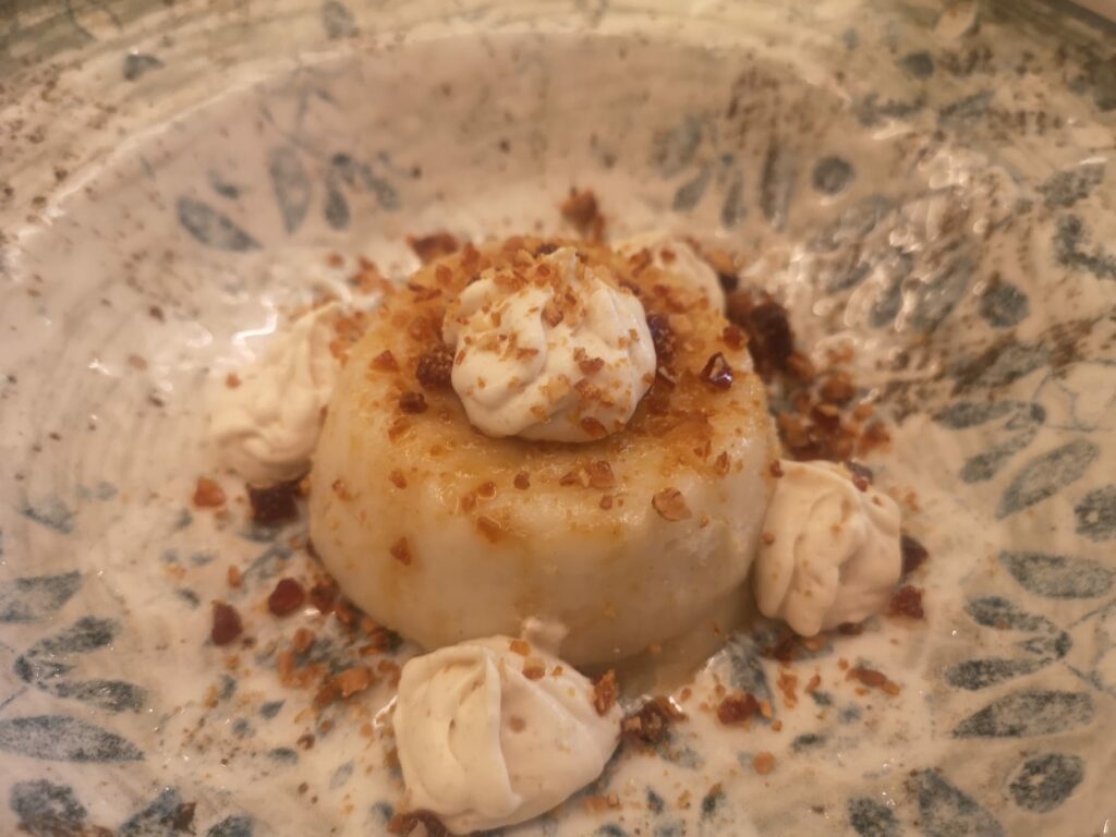 In alternativa per i vegetariani, ma in realtà per tutti ì palati, un risotto allo zafferano con funghi porcini e perle di olio al prezzemolo. Seguono la stessa filosofia “A caccia di coniglio”, coscia di coniglio ripiena di olive Nocellara e capperi in agrodolce su una golosa salsa alla cacciatora, il secondo veg caciocavallo all’argentiera con verdure di stagione. Quanto ai dessert in carta, bisogna ammettere che vi è l’imbarazzo della scelta. Nel dubbio optare per un delicato biancomangiare alla mandorla che chiude in dolcezza una passeggiata tra i sapori e i colori di campagna, ci è apparsa la scelta migliore che ci sentiamo assolutamente di consigliare.