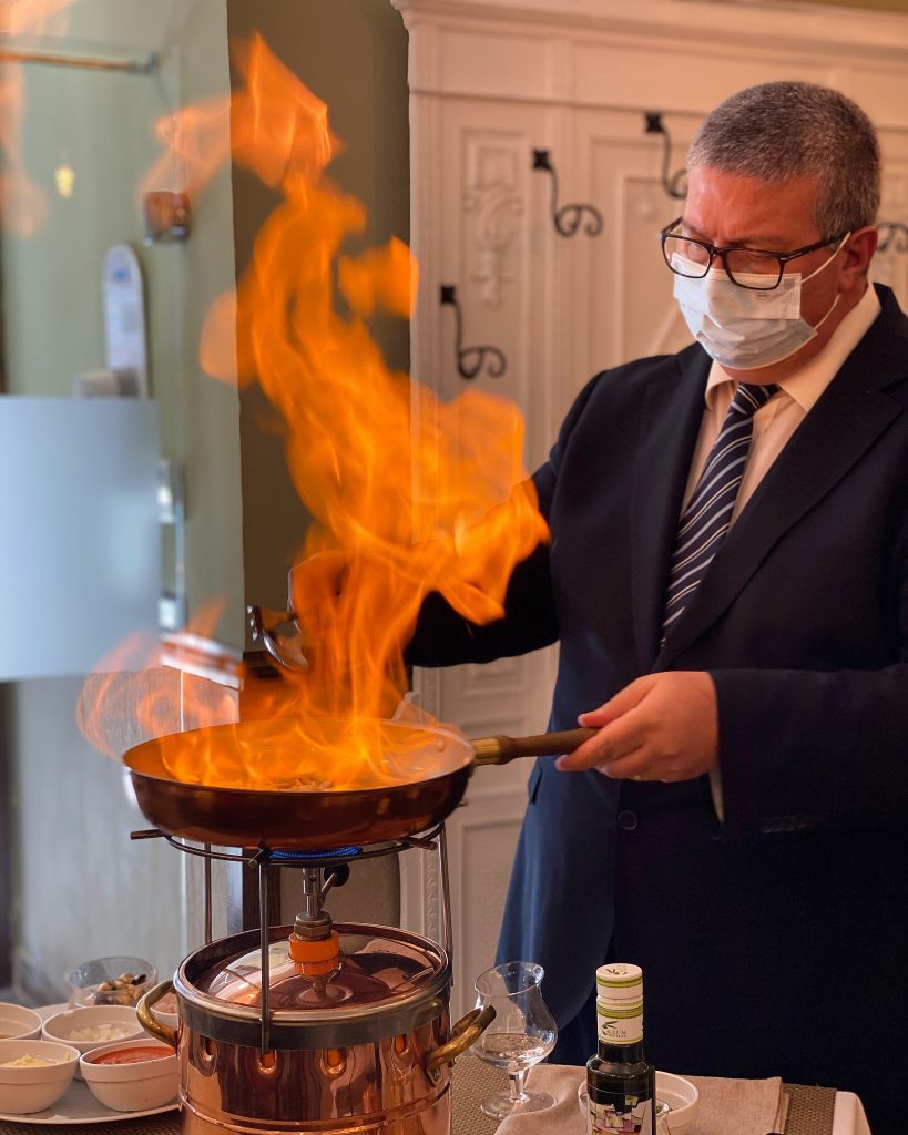 “Ho iniziato la mia attività negli anni ‘80, all’età di 17 anni, cucinando alla lampada in uno dei ristoranti più rinomati della città. Una passione innata che ho continuato a coltivare negli anni tra illustri alberghi e ristoranti del capoluogo. Ritengo che il Flambè sia tra le tecniche di cottura la più romantica, affascinante e spettacolare. Stupisce sempre e tutti, richiede però qualche piccola accortezza e un po’ di maestria” continua Emanuele Ferrara, figura importante nel panorama della cucina di sala palermitana.