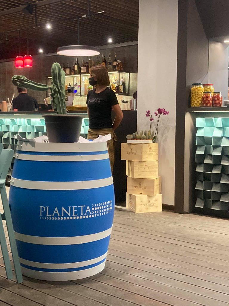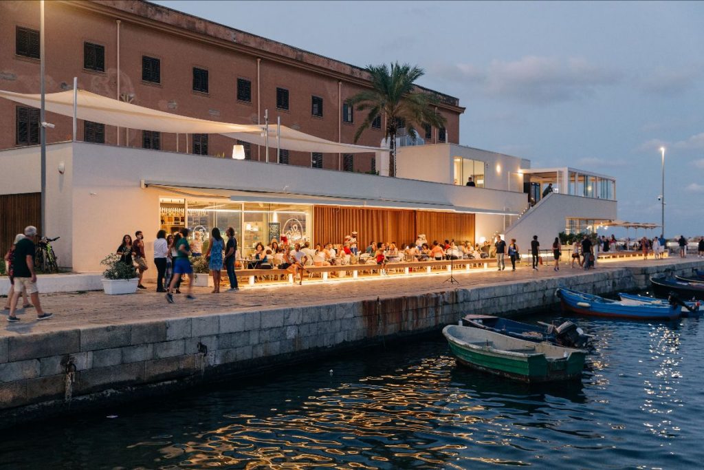 Lo spazio, pensato dall’architetto francese Andrea Ballà, è un continuo dialogo tra interno ed esterno, mare e città, un luogo che è molo ma anche barca con la sua atmosfera da yatch club e gli interni in acciaio, legno e colori pastello su cui domina una morbida tonalità satura del verde acqua. Materiali estremamente tattili dal forte contrasto visivo, dove il caldo delle scanalature in legno incontra il freddo luccicante dell’acciaio e i moduli libreria accolgono prodotti, conserve e bottiglie, come in una cambusa ben assortita. Le sedie lasciano spazio a sedute artigianali che ricordano le casse dei vini, al centro il grande tavolo sociale sospeso su cui accomodarsi per guardare le onde del mare. All’esterno il teak è naturalmente protagonista nell’area allestita con tavoli e ombrelloni per godere per tutta l’estate – ma anche nel tiepido autunno siciliano- della rilassante atmosfera da marina club.