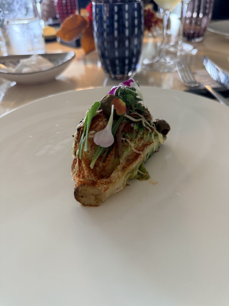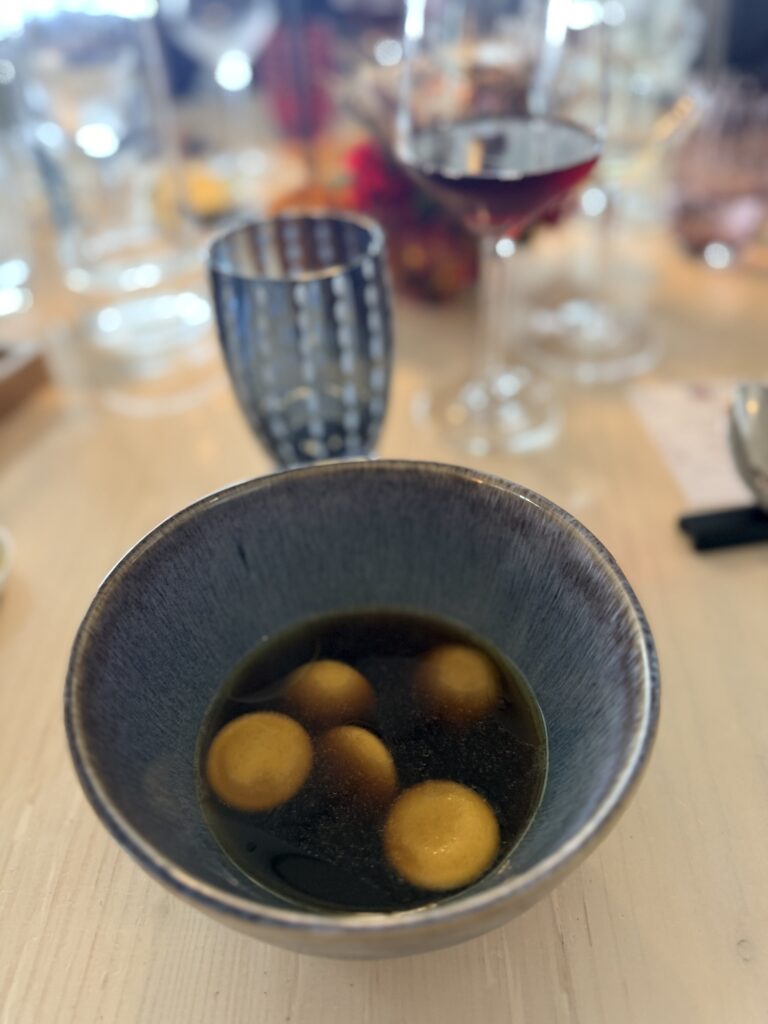 L’attenzione al dettaglio prosegue nei secondi con l’ombrina alla brace, sostenuta da un fondo alla cacciatora e salsa di erbe amare, e con una sorpresa fuori menu: un coregone lavorato con grande precisione, capace di esprimere la delicatezza del pesce di lago con struttura e profondità. Dopo il dessert Terre di Tuscia, firma dolce dello chef, la chiusura è affidata all’Amaro 33 – PN Lab, un prodotto di grande spessore che suggella l’esperienza con una nota di carattere.