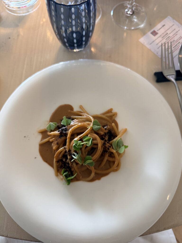 Se l’intero menu convince per equilibrio e rispetto della materia prima, sono i primi piatti a rappresentare il punto di forza della proposta. Lo spaghettone artigianale Mancini con ricci, nocciola e caffè è un esempio emblematico di come lo chef riesca a costruire profondità attraverso contrasti netti ma armonici, mantenendo eleganza e pulizia. Allo stesso modo, i bottoni di fagiano con salsa al ginepro e tartufo mostrano una mano sicura nella gestione della componente liquida. Le salse, in generale, sono tra gli elementi meglio riusciti del percorso, mai invadenti e sempre centrate, definiscono il carattere delle portate senza sovrastare gli ingredienti principali.