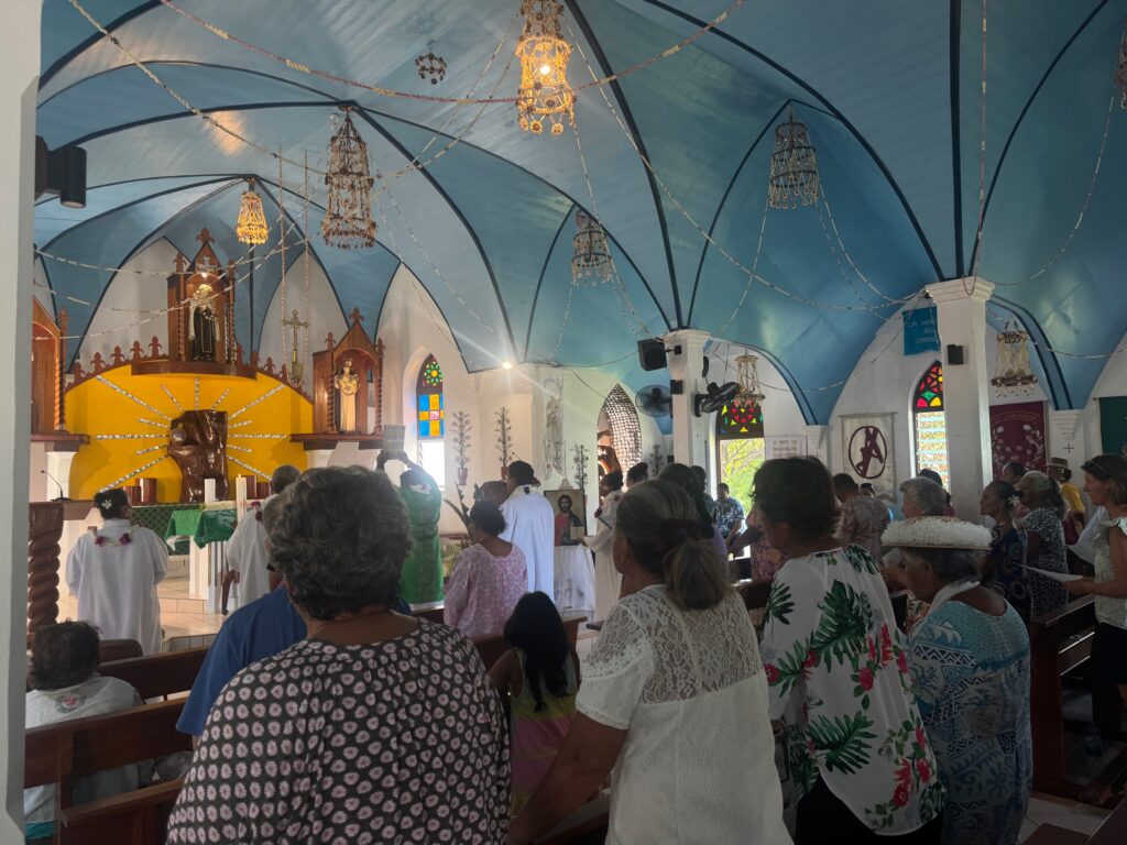 Una deliziosa mattina sull’isola di Fakarava, riserva Biosfera Unesco nell’arcipelago delle Tuamotu in Polinesia Francese. È la prima entusiasmante tappa della crociera a bordo dell’Aranui, la nave cargo alla volta delle Isole Marchesi, selvagge, remote e autentiche. Una mezza giornata ideale per rilassarsi spezzando l’incedere spedito dell’imbarcazione che solca le lunghe onde del Pacifico del Sud. Ad attendere i forestieri c’è un’esperienza imperdibile: la messa nella chiesa cattolica, suggestiva e magnetica con i suoi canti, che comincia alle ore 8:30 della domenica, proprio quando si approda in questo piccolo paradiso terrestre amato per il diving. In sella a una bici, che è possibile affittare, si raggiunge il luogo sacro, dove il prete con indosso una corolla di fiori bianchi e rosa, dà il benvenuto ai visitatori che arrivano dalla Francia, ma anche dall’Italia, dall’Australia e dalla Nuova Zelanda. Un’experience immersiva a contatto con la comunità locale che si raccoglie nella inaspettata chiesetta a tre navate con caratteristici lampadari e filari di conchiglie, o con le nicchie occupate da sorprendenti statue sacre realizzate in madreperla. Tutto incanta durante la funzione religiosa in doppia lingua, in tahitiano e in francese. In particolare, le letture sacre di devote scalze che indossano per l’occasione abiti colorati a fiori o di pizzo bianco, e con la capigliatura raccolta e appuntata con il fiore di tiarè, o ancora, tenuta in ordine da un cappellino. Ma anche la musica, suonata da chitarre e ukulele e cantata dai partecipanti alla messa, con trasporto e grazia.