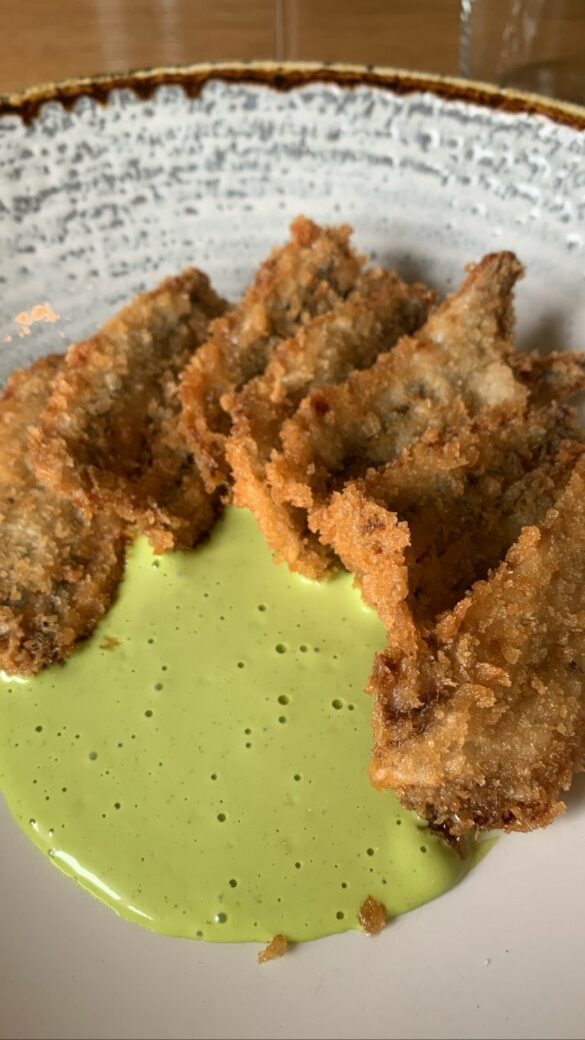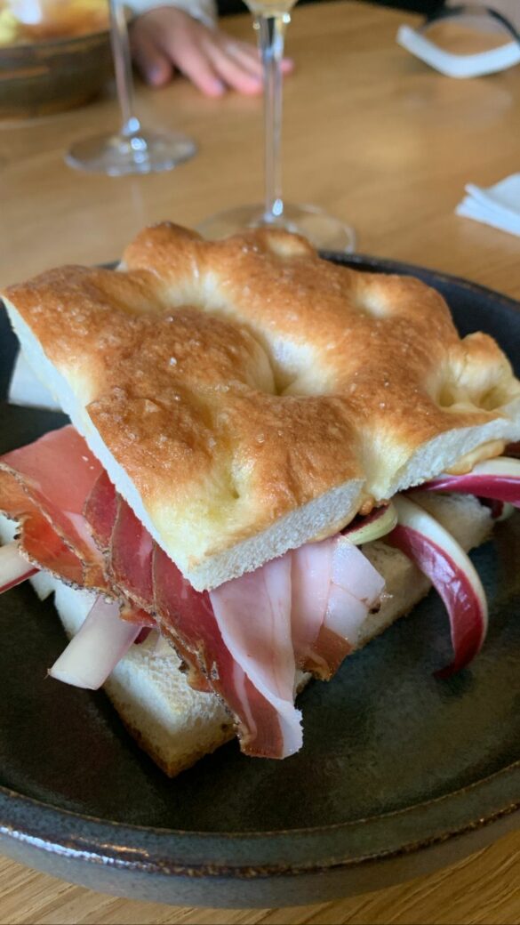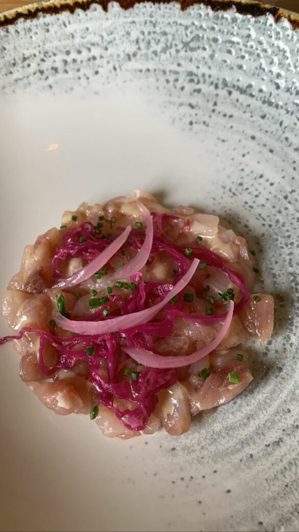 La sostanza di alcuni piatti affianca la raffinatezza di altri. Si passa infatti dal Crudo di manzo, porcini, parmigiano 24 mesi e porro alla Focaccina pugliese con spalla di maiale, scamorza affumicata calda e radicchio. O ancora dalla Tartare di pescato, cipolla di Tropea, verza rossa, sesamo ed erba cipollina alle Alici in panko, che sono ben sette grandi pezzi, con accompagnamento di salsa verde.