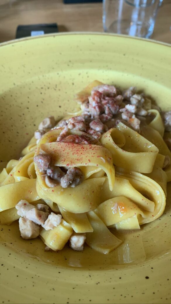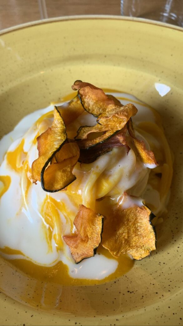 Buone anche le proposte vegetali. Tra queste la Chitarra Mancini con zucca mantovana e fonduta ai quattro formaggi delicata, chiaramente dolce ma ben bilanciata con i formaggi che non coprono il piatto lasciando una gradevolezza al palato come ogni altra portata.