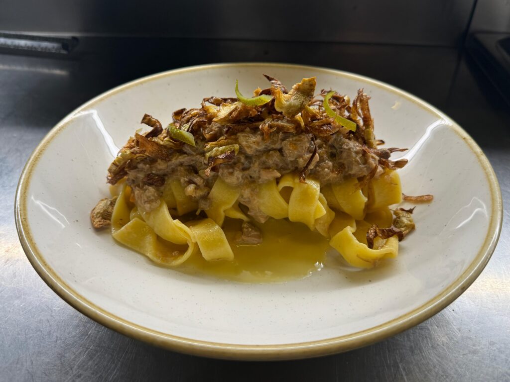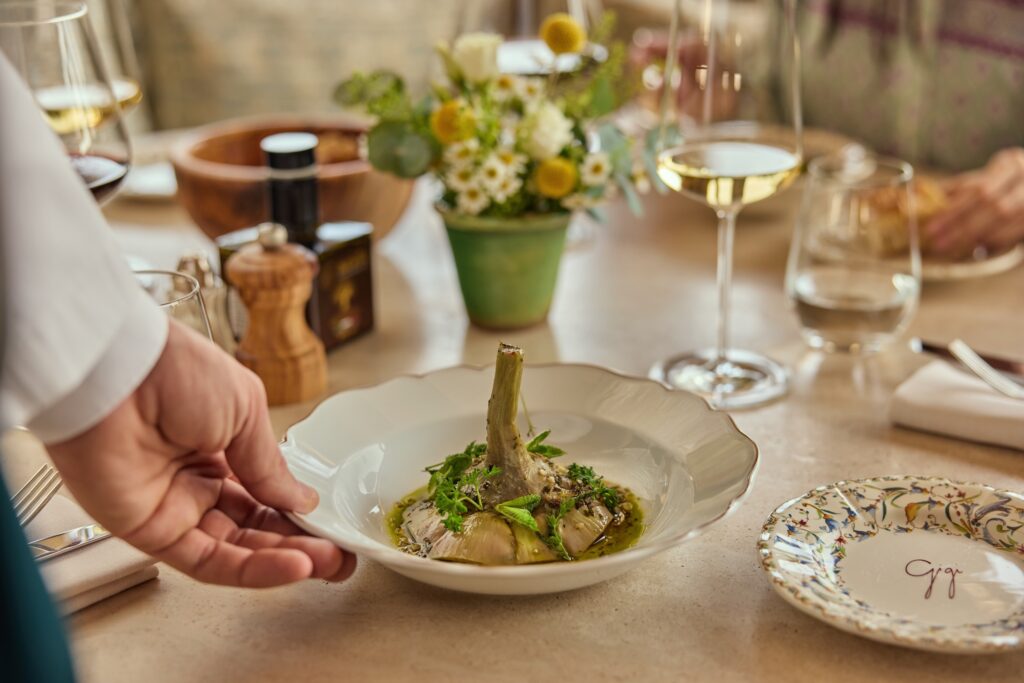 Dopodiché, arriva in tavola il carciofo alla romana, cotto dolcemente fino a diventare fondente e profumato di mentuccia selvatica. Si prosegue con la chitarrina al ragù di vitello, dove i carciofi ritornano come filo conduttore del menu, quindi costolette di agnello in crosta di pane alle erbe, servite con patate e cicoria ripassata. La chiusura è con un semifreddo di pastiera, che trasforma il dolce tradizionale in una texture leggera e cremosa dagli intensi profumi agrumati.