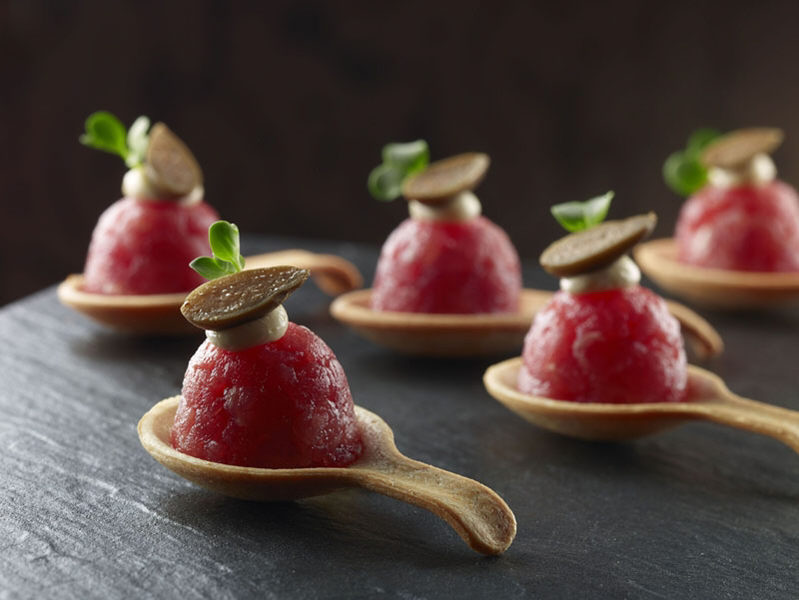 Ecco quindi arrivare sul tavolo dell’aperitivo “Cialde croccanti al cacao con mousse al tartufo”, “Crema di melanzane con frollino alle olive”, “Insalata di granchio con mele su pan di spagna al te’ matcha”, “Pane al cacao e segale con salmone affumicato e cioccolato bianco”, “Cestino di frolla alle mandorle e lime con gelato alla mandorla salata”: un trionfo di sapori e abbinamenti inconsueti pronti a cancellare i confini della pasticceria classica e a ridisegnare quelli di un aperitivo di gran classe.