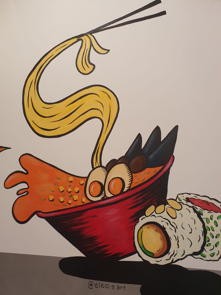 L’ambiente è fresco e raccolto, arredato con i toni del legno e del bambu che fanno contrasto con il bianco candido delle pareti e con i riflessi delle grandi vetrate che si affacciano sulla strada. Un murales, ormai marchio di fabbrica dei locali di Akira, troneggia sulla sala raffigurando una traboccante ciotola di ramen.