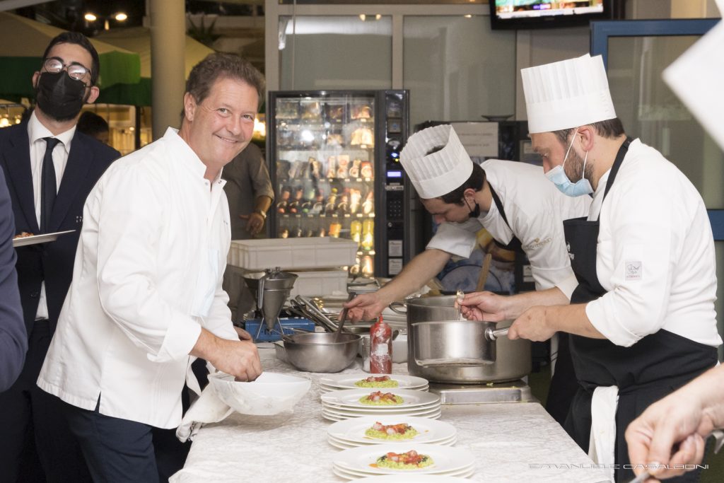 La cena è stata curata da “Chicco” Cerea, executive chef del ristorante Da Vittorio di Brusaporto, che ha cucinato, alcuni piatti simbolo del noto locale lombardo: Spaghetto di tonno con bagnacauda e crumble di pistacchi; Risotto mantecato al pesto con gamberi ed emulsione di pomodoro; Paccheri alla Vittorio cucinati all’onda; Fragole e Champagne; Kermesse di dolci. A completare la cena il pane di Niko Romito, chef del ristorante 3 stelle Michelin Reale di Castel di Sangro, e i vini di famiglia Cotarella in formato Magnum: Sorè 2020, Ferentano 2017, Le Macioche Brunello di Montalcino 2016, Pomele 2020.