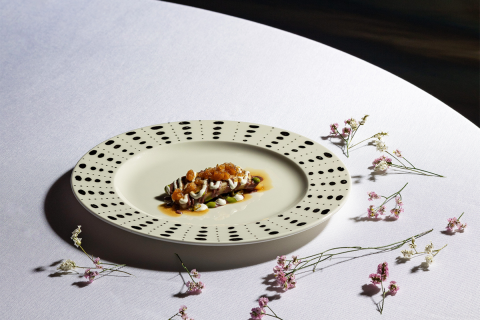 Completate il piatto nappando con le tre salse: burrata, cagliata di fico e salsa di bucce di melanzana.I