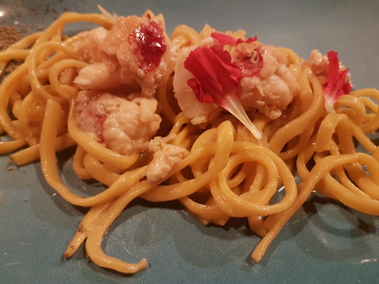 Tra gli antipasti possiamo trovare la tataki di tonno bianco, con sedano e meringa di cipolla di Tropea (18 euro), fonduta di gorgonzola dolce, fritto di vitello allo speck e tartufo bianco (28) e foie gras, gelatina di mandorla, ristretto di caffè e grissini (25). Riso Carnaroli con Sagrantino di Montefalco, animelle e zucca candita (20) e spaghetto quadrato di limone, astice e terra di salvia (25) tra i primi.