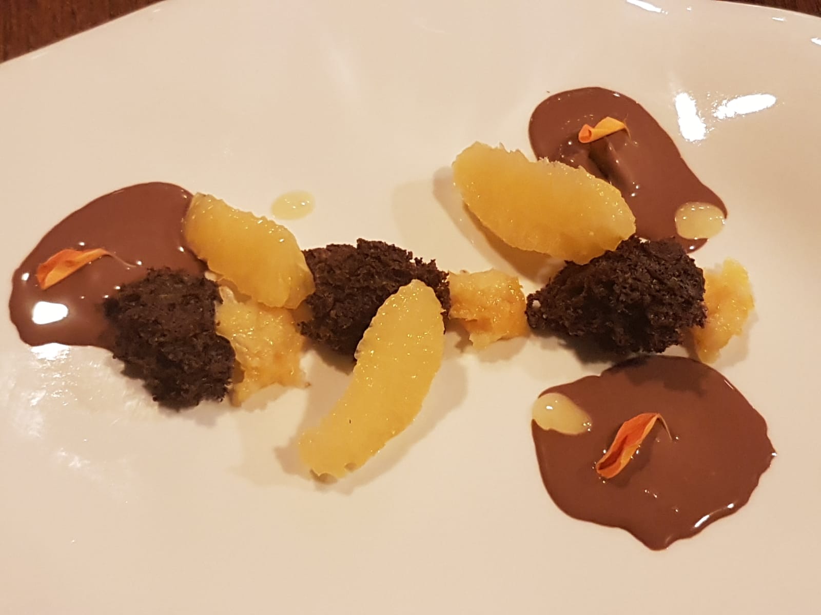 Passiamo ai dolci con le golosissime pere con panna morbida alla lavanda, miele e crumble (12) e la ganache al cioccolato fondente con marmellata di arance, spugna al cacao e spicchi di arancia ghiacciata (12).