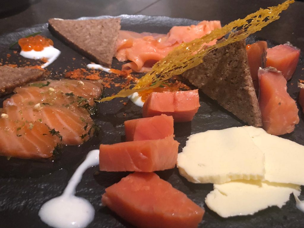 Cinque tipi di salmone in Boreale, con Gravalax di salmone marinato all’aneto, salmone norvegese affumicato, salmone scozzese biologico delle isole Orcadi, salmone selvaggio Red King del Canada e uova di salmone keta serviti con burro francese Pamplie, salsa allo yogurt e pane nero (35 euro).