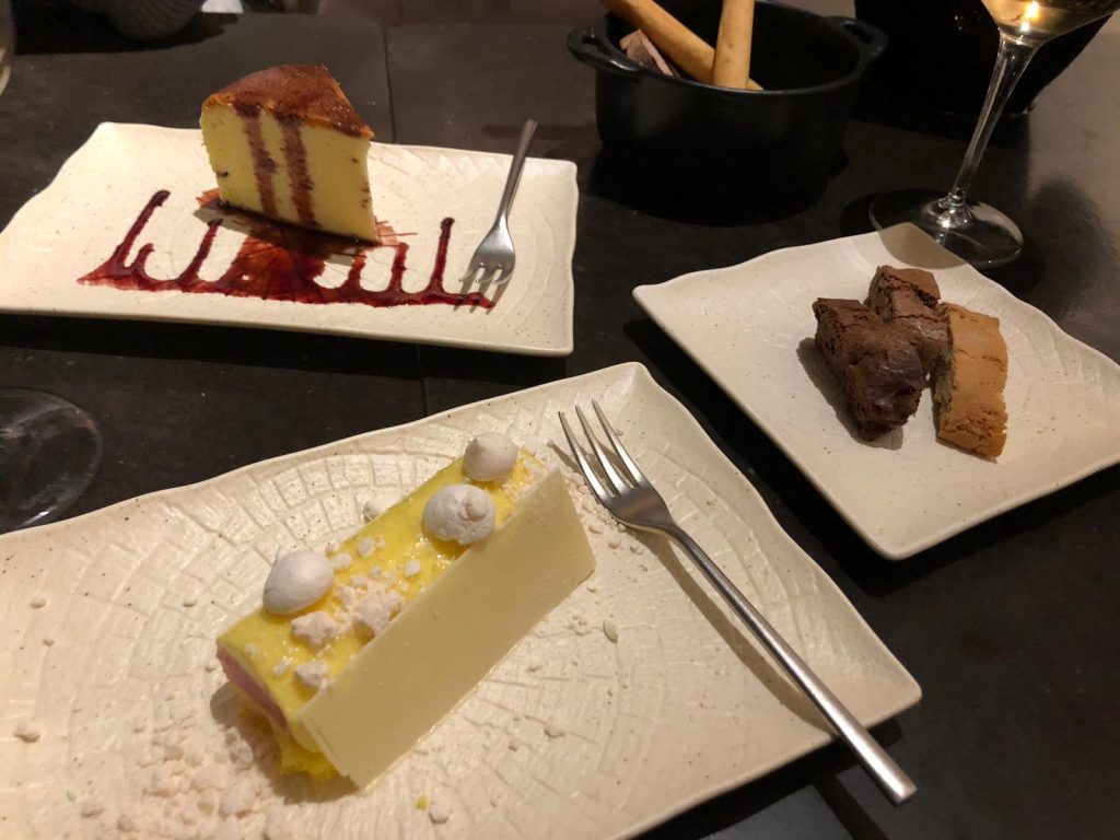Cinque i dessert: la golosa Sacher Torte, la tradizionale crostata con ricotta e visciole, un bisquit meringato con fragole e limone, una jiggly cake al formaggio e i tozzetti dei Fratelli Lunardi.