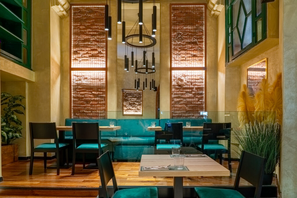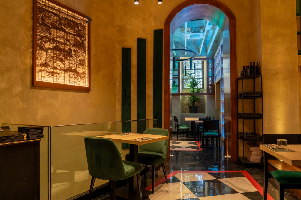 L’arredamento mantiene l’eleganza della sede di Coppelle, con predominanza di verde in velluto, dettagli dorati, pavimento in marmo e soffitti alti, arricchiti da lampadari moderni e un’impostazione interna studiata per ospitare l’aperitivo in stile romano.