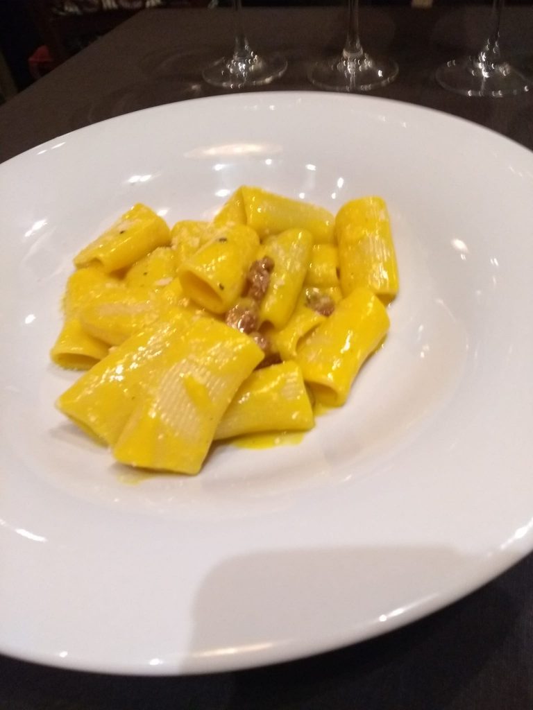 Terzo vino, il DØM Franciacorta Dosaggio Zero Riserva, 2012; 60% Chardonnay, 25% Pinot Nero e 15% Pinot Bianco, oltre 80 mesi sui lieviti. Un mescla di frutta esotica macerata, miele, tostatura e meringa. Pieno in bocca, di grande personalità ed eleganza, con una freschezza equilibrata e ben bilanciata. Abbinato a uno dei piatti forti della cucina del Quinto Quarto, la Carbonara dello chef Federico Iannacci. Quando hai un gran bel vino e un gran bel piatto, l’abbinamento viene da sé…