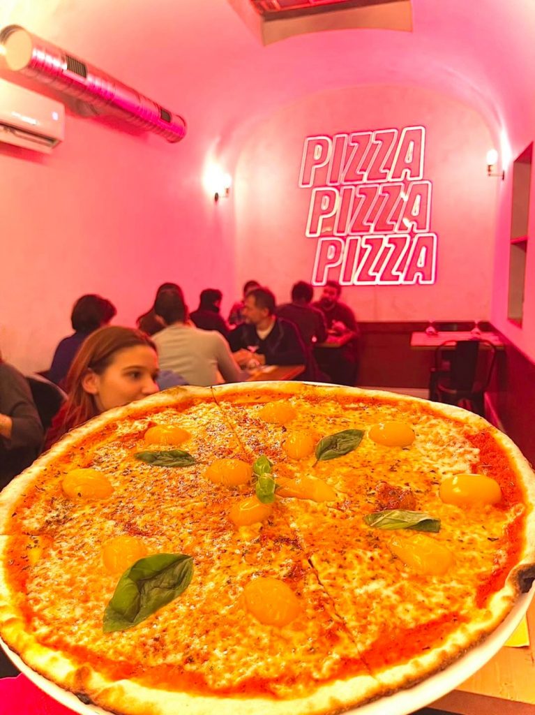 Il locale moderno ed essenziale, è decorato da una simpatica scritta al neon che invita a mangiare la pizza. Semplicità è la parola d’ ordine in questo locale. Le pizze sono le romane classiche fini e croccanti al punto giusto, però realizzate con materie prime di qualità e condimenti non troppo gourmet (anche se la creatività non manca).