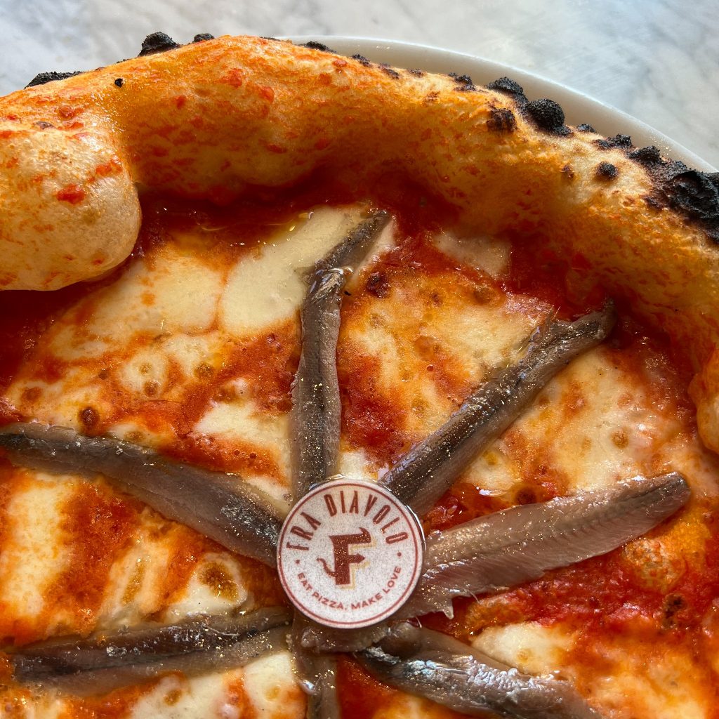 La scelta va dall’impasto classico a base di farina con fiocchi di germe di grano, per una pizza intensamente fragrante e saporita; a quello nero vegetale con carbone vegetale in polvere per una pizza gustosa, molto leggera e digeribile; infine c’è quello multi-cereali con farro, farina integrale e cereali misti interi, un impasto ricco di proteine e sali minerali, che dà vita a una pizza dal gusto rustico e intenso. La pizza di Frà diavolo è una napoletana contemporanea con il bordo alto e alveolato. 22 tipi di pizze tra classiche e pop, tutte con topping originali, abbondanti e di ottima qualità, a partire dal pomodoro biologico. Tra le più amate: la “Fichi si nasce” con crema di Fiordilatte, Prosciutto Crudo di Norcia “LUI” Renzini IGP, Stracciatella, Mostarda di fichi, Olio evo; e “Lampone e Oltre” Fiordilatte di Agerola, Stracciatella, Mortadella “OLTRE” di cinghiale tartufata Renzini, Lamponi, Basilico, Olio evo.