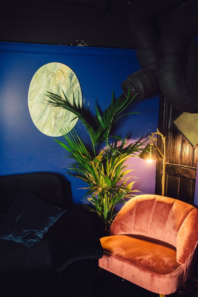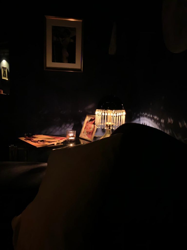 Una ripida scala conduce al piano inferiore dove un altro bancone bar fa da anticamera a un salottino intimo e quasi familiare, dominato dai toni del blu e sempre arredato con velluti, oggetti di design e cornici con ritratti vintage che ricorda un po’ un night club d’altri tempi.