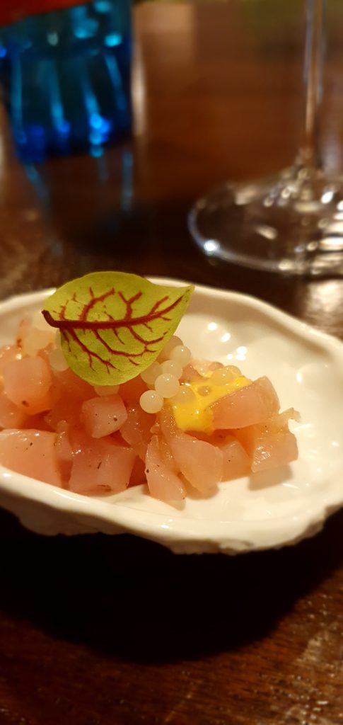 Intrigante l’amouse bouche in 4 portate: distillato di pasta e patate, ringo di pasta frolla salata, pecorino e pere al cognac, bon bon di mozzarella affumicata di bufala con ciliegino arrostito e pomodoro al basilico e finta ciliegia di fegato wagyu, gel allo yuzu e fiore elettrico (o Sechuan Button, un fiore che provoca un senso di formicolio a labbra e lingua desensibilizzando il palato).
