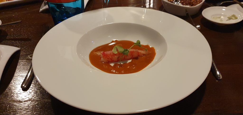 Il menu degustazione (dinner 9 portate a 70 euro, lunch 3 portate a 30 euro) è studiato seguendo l’alternanza di sapori esotici e piatti più “nostrani”. Si parte con gambero rosso di Mazara del Vallo crudo servito con un curry tiepido di gamberi dal sapore intenso e avvolgente, servito con il Costacielo 2018 di Lunarossa, seguito dal gel di anguria, acqua di mare, bottarga e olio al basilico.