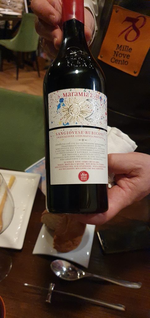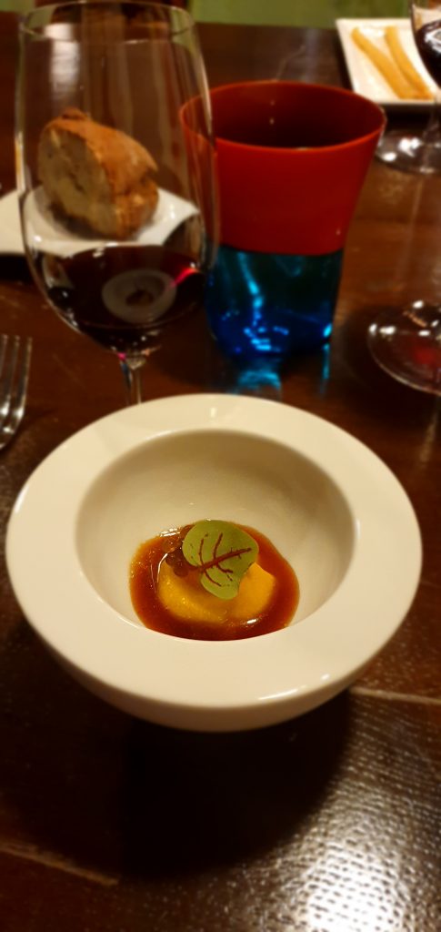 Un Sangiovese Rubicone Maramia 2018 ha invece accompagnato il Pho-Men, soba di grano saraceno, uovo di quaglia al miso, carpaccio di anatra marinata in brodo umami di anatra arrosto. Un piatto dal forte profumo d’oriente, con un brodo molto speziato e saporito e spaghetti tiepidi sconditi fatti in casa.