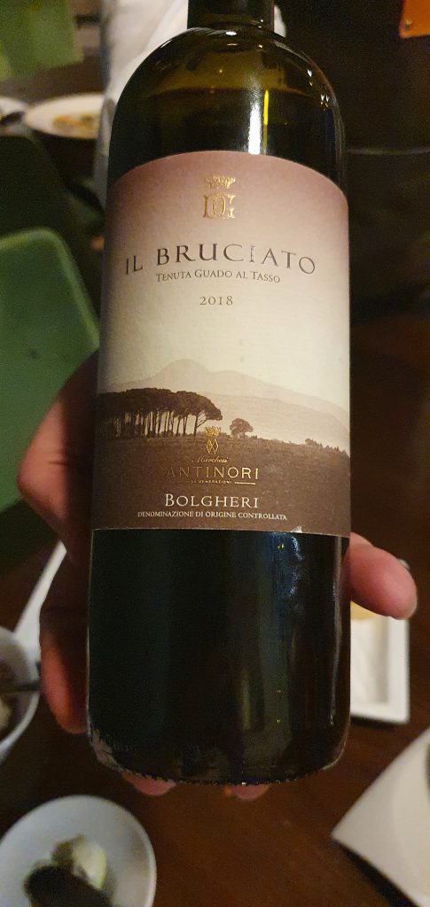Si ritorna in Italia con A Priscilla, un piatto ispirato alla fidanzata di Valerio: un bottone ripieno di parmigiano e tartufo con fondo di manzo e caviale di tè servito con Bolgheri Rosso DOC Il Bruciato 2018 di Antinori. Un tortello da mangiare in un sol boccone, da far “scoppiare” in bocca sprigionando tutto il suo interno liquido e gustoso.