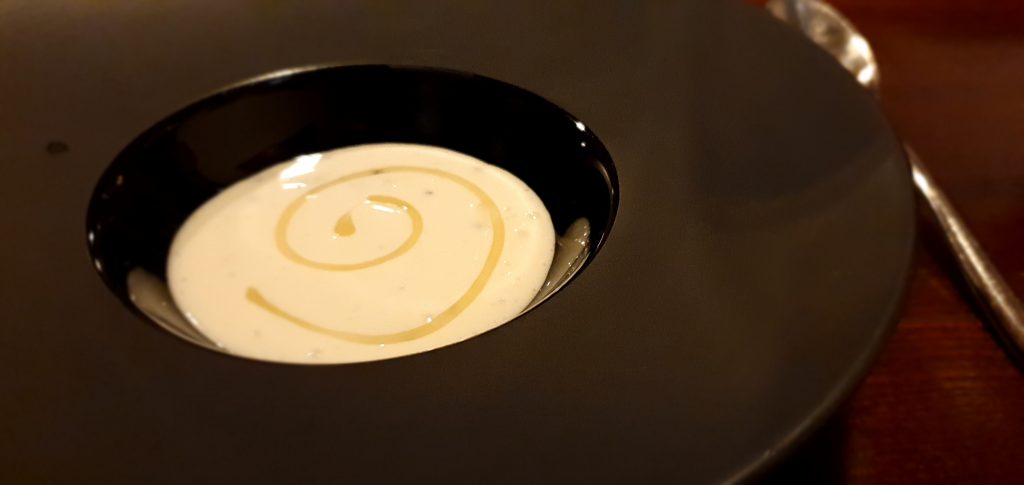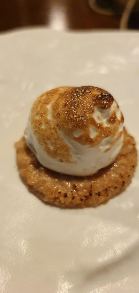 Un ottimo liquore allo yuzu ha accompagnato il gelato sciolto al pepe Sansho, bergamotto e caviale affumicato seguito da una versione dolce del pane e olio, un cremoso al cioccolato bianco con olio e croccante di sale e pane.