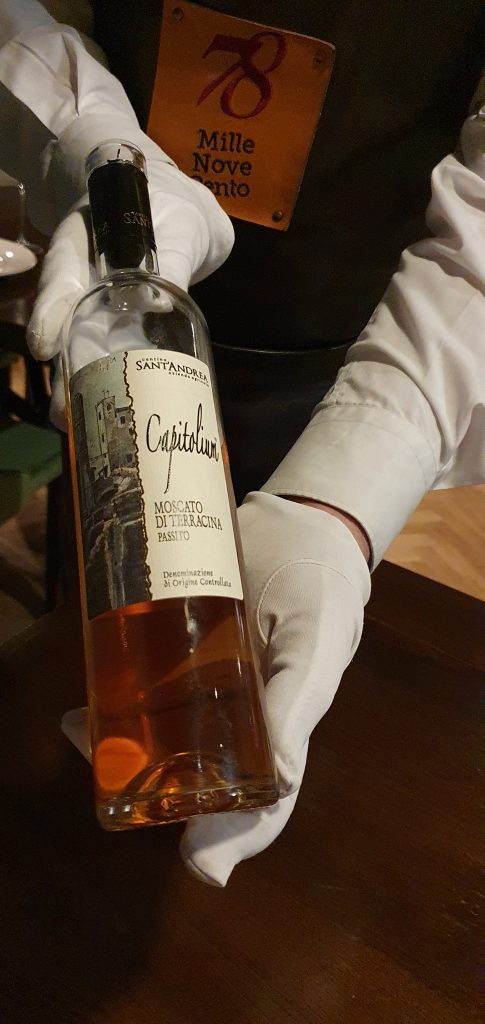 Coccole finali con “il contadino”, finta arachide di pralinato alle arachidi e terra al cacao salato, e un tris di tartufino al cioccolato fontente e carbone vegetale, croccante allo yuzu con meringa all’italiana e senzu. Dulcis in fundo: il Moscato di Terracina Passito Cantina Sant’Andrea.